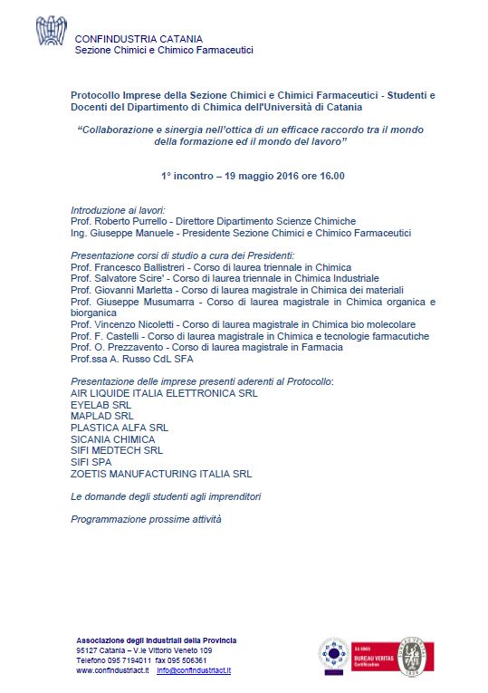 Si informano gli studenti del CdS iscritti al II e III anno, che domani 19 maggio 2016 alle ore  16.00 presso l'aula A del Dip. di Scienze Chimiche, si svolgerà un incontro nell'ambito del -Protocollo Imprese della Sezione Chimici e Chimici Farmaceutici - Studenti e Docenti del Dipartimento di Chimica dell'Università di Catania- avente come oggetto: “Collaborazione e sinergia nell’ottica di un efficace raccordo tra il mondo della formazione ed il mondo del lavoro”.