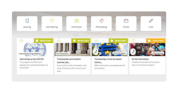 Il Finder (https://programmes.eurodesk.eu/learning) fornisce un grande e aggiornato database delle opportunità disponibili al momento o nei prossimi mesi. Fornisce altresì informazioni su bandi competitivi per l'assegnazione di grants in vari campi di ricerca e lavoro.